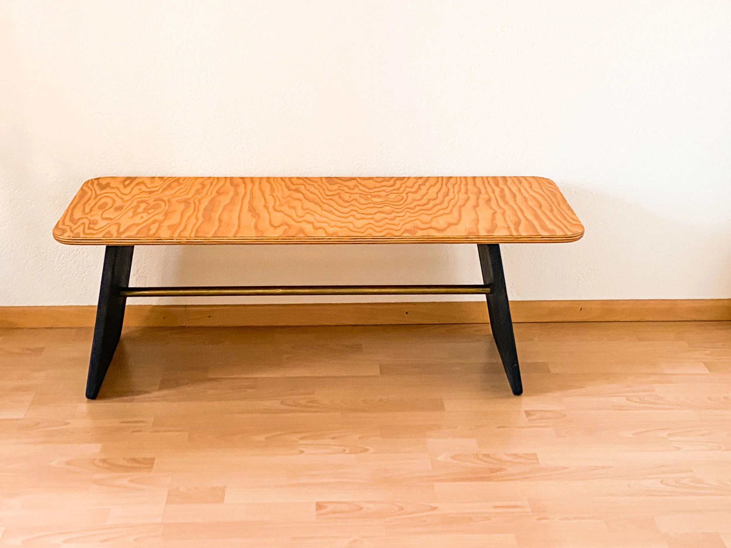 It consists of two solid, stained beechwood legs, a seat made from marine pine plywood, and a brass tube that stabilises the angled panels.